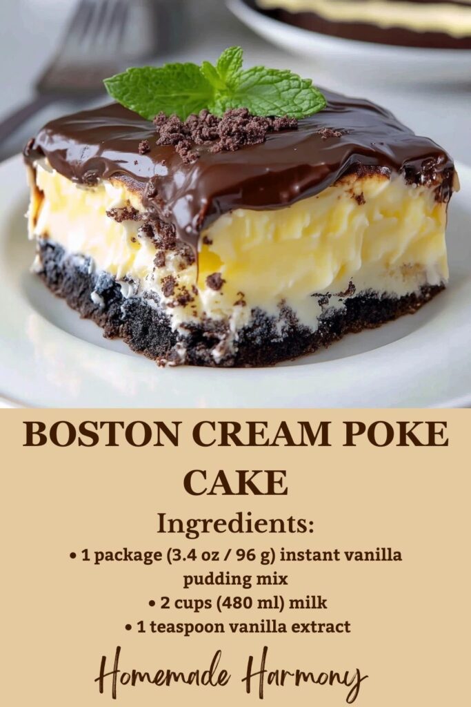 Well, the Boston Cream Pie itself has an interesting history, dating back to the 19th century when, in Boston, Massachusetts, it was made originally as a layered sponge cake filled with custard and topped with chocolate glaze. Over time, bakers adapted this concept to the simpler method of poke cake, making it easier and faster to prepare while retaining all the decadent flavors. Today, the Boston Cream Poke Cake is a favorite for birthdays, family gatherings, and festive occasions because it’s creamy in the center and has a chocolatey top that is simply crowd-pleasing.