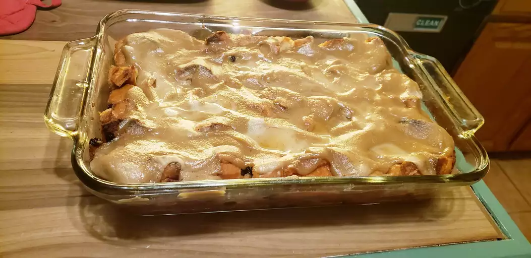 Pour egg mixture over the bread and gently toss it. Pour the entire mixture into a 9 by 11 casserole dish. Cut the 3 tbsp of butter into small pieces. Spread them over the pudding. Bake the pudding for 35 to 45 minutes or until the top is golden and crusty.